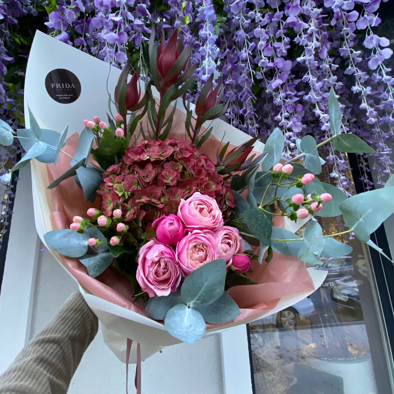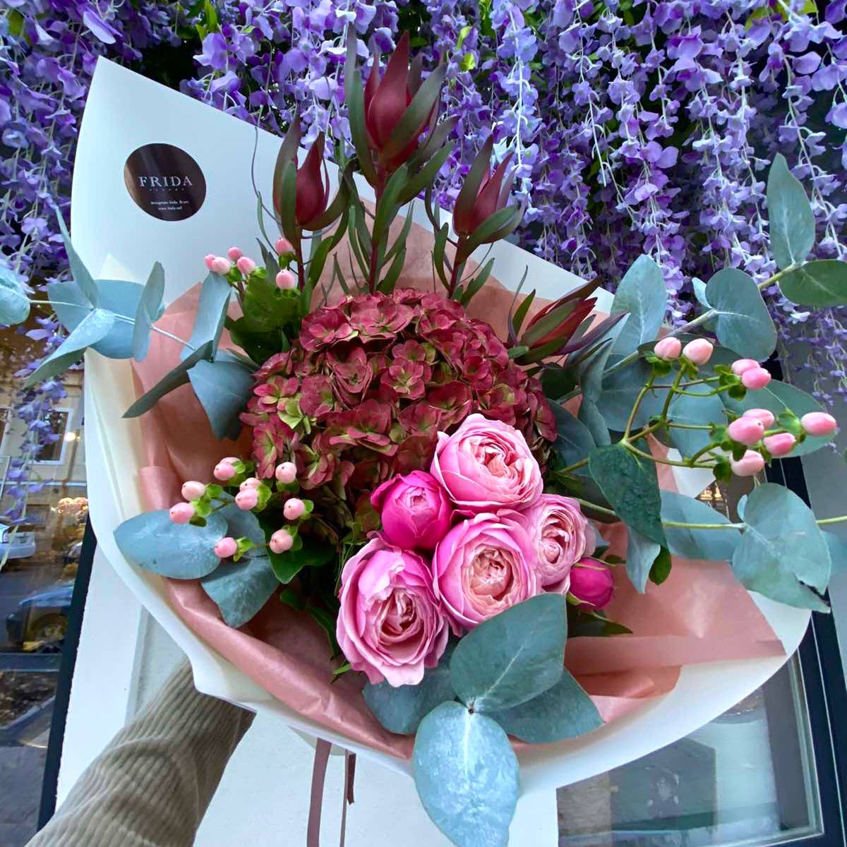 Букет в теплой осенней гамме, состоит из гортензия осенняя, гиперикум, леукадендрон, пионовидная роза, эвкалипт, корейская упаковка