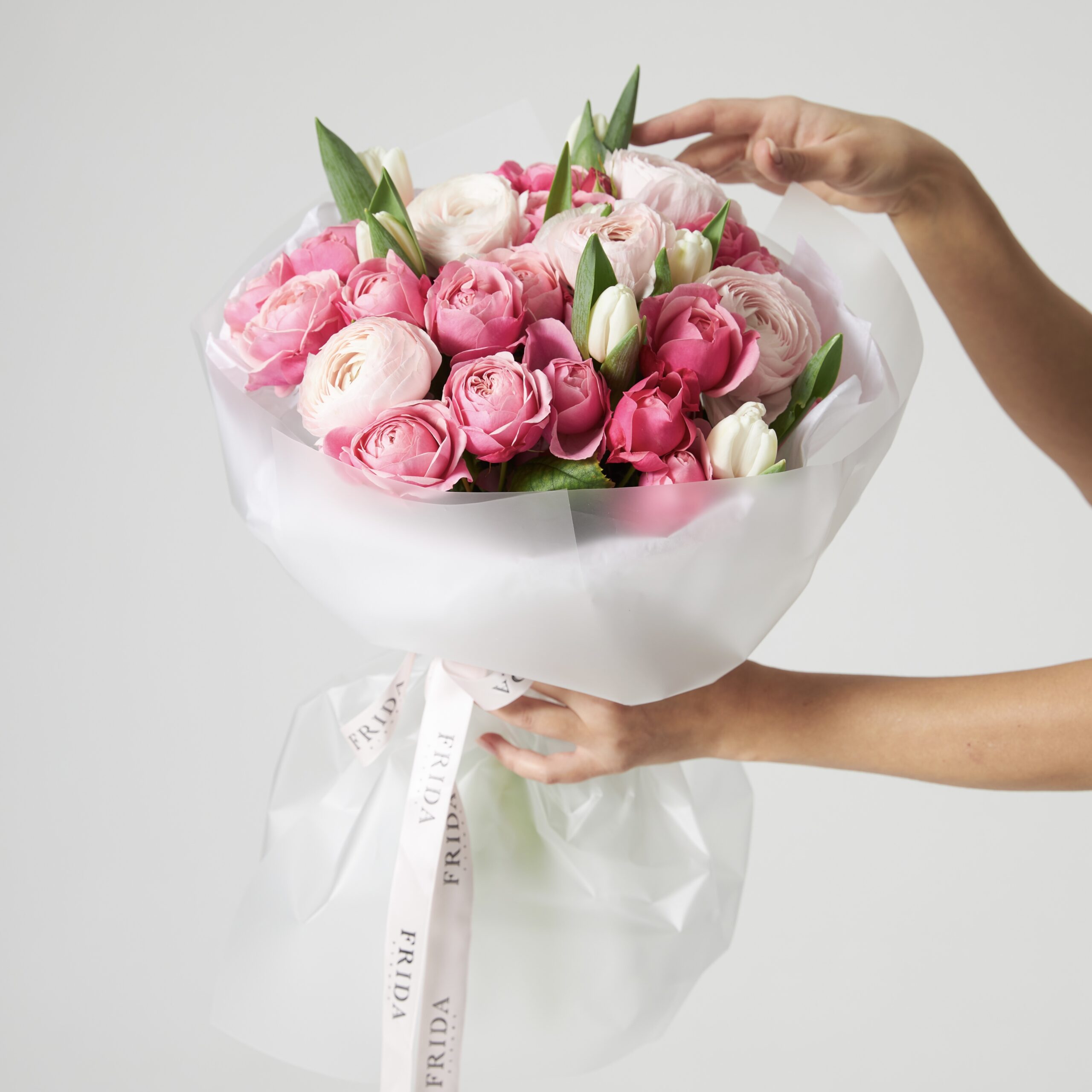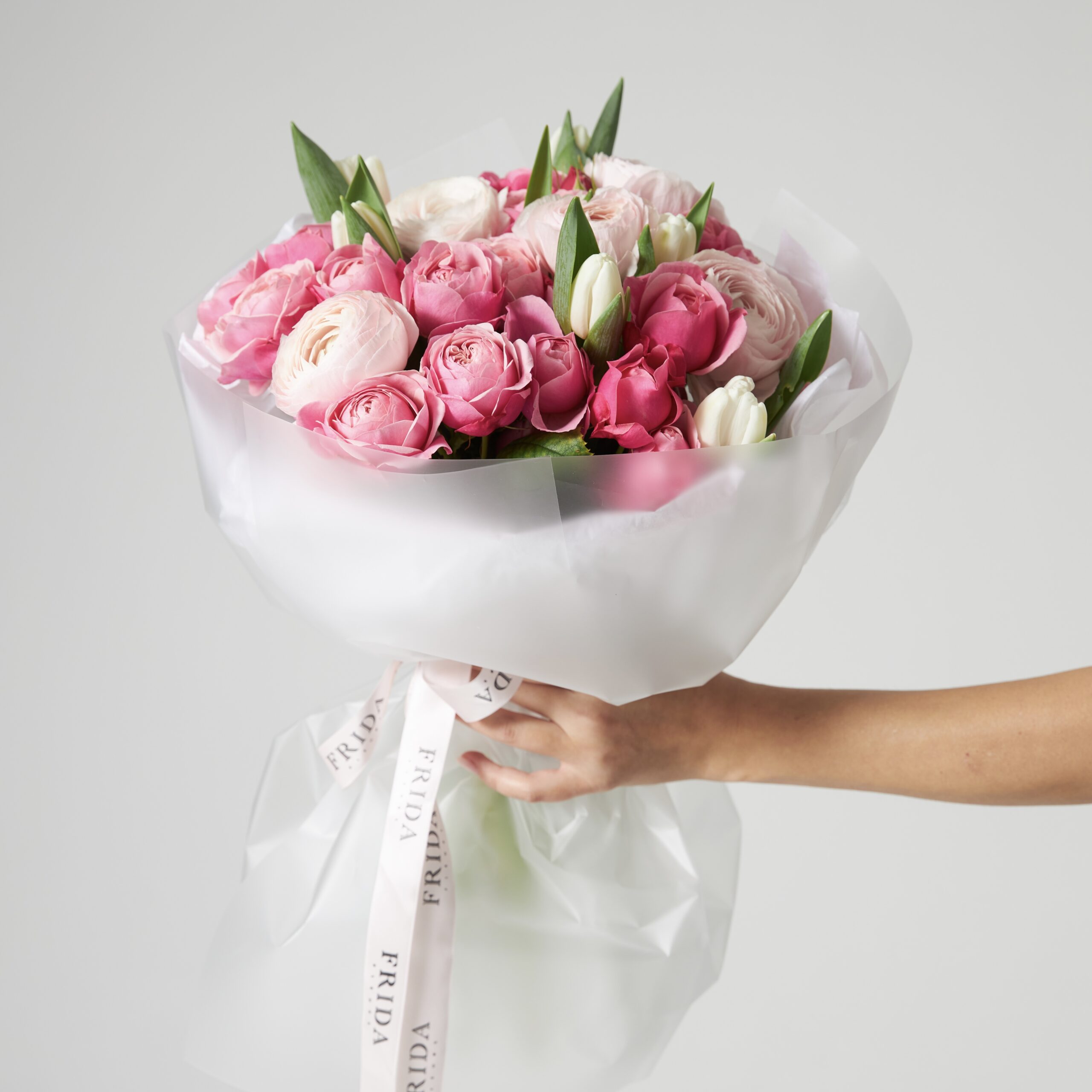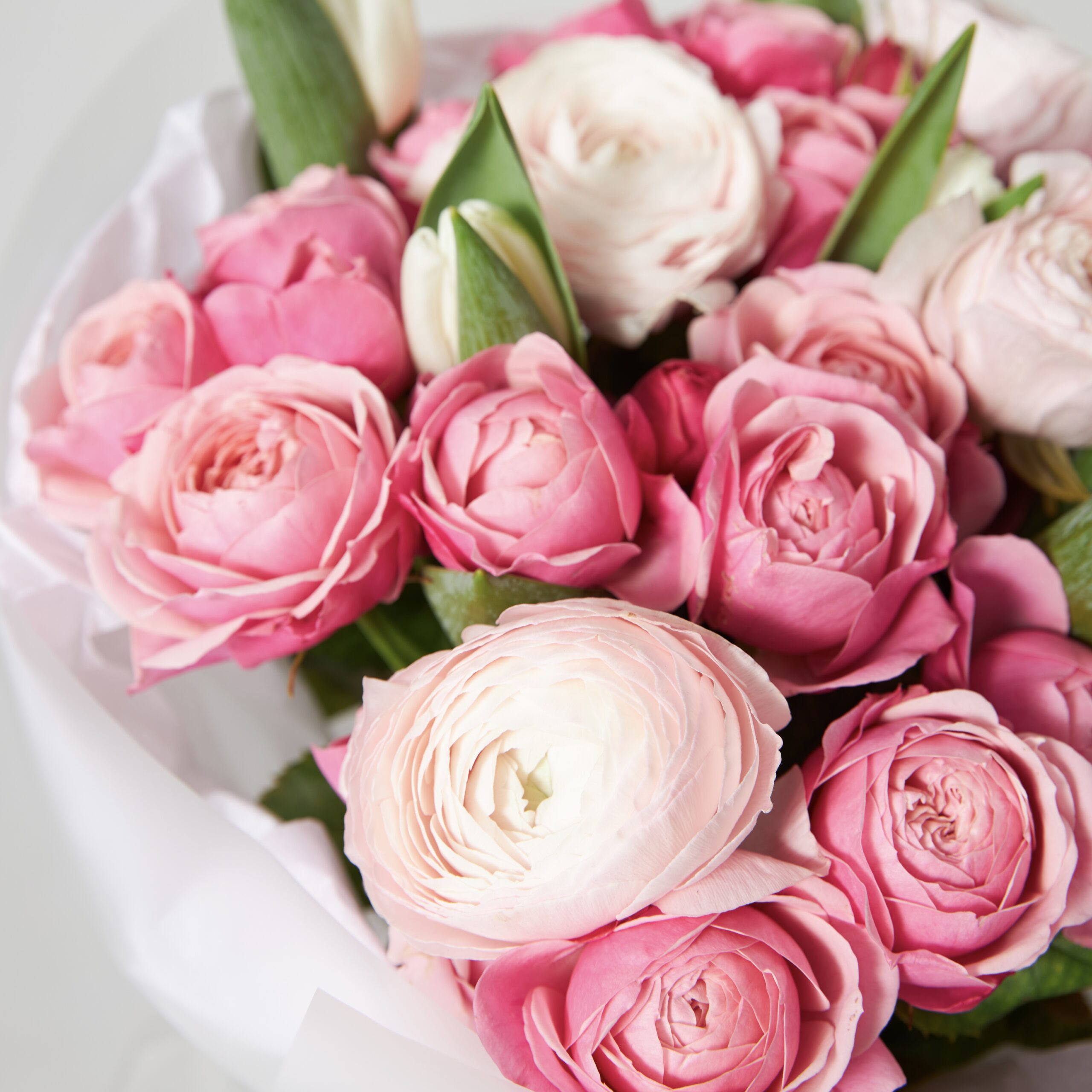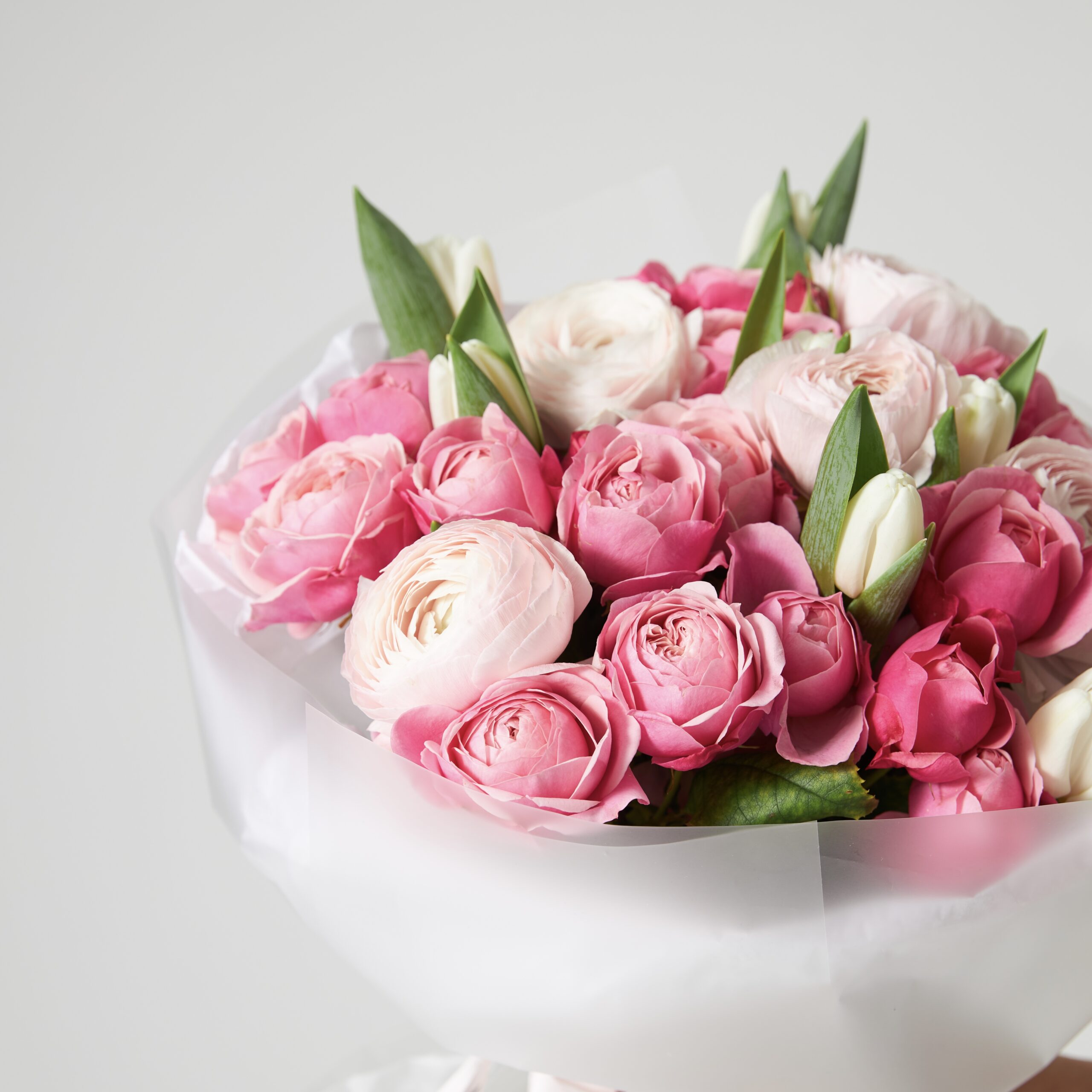Состав букета: пионовидная роза, ранункулюс, белые тюльпаны, прозрачная матовая упаковка