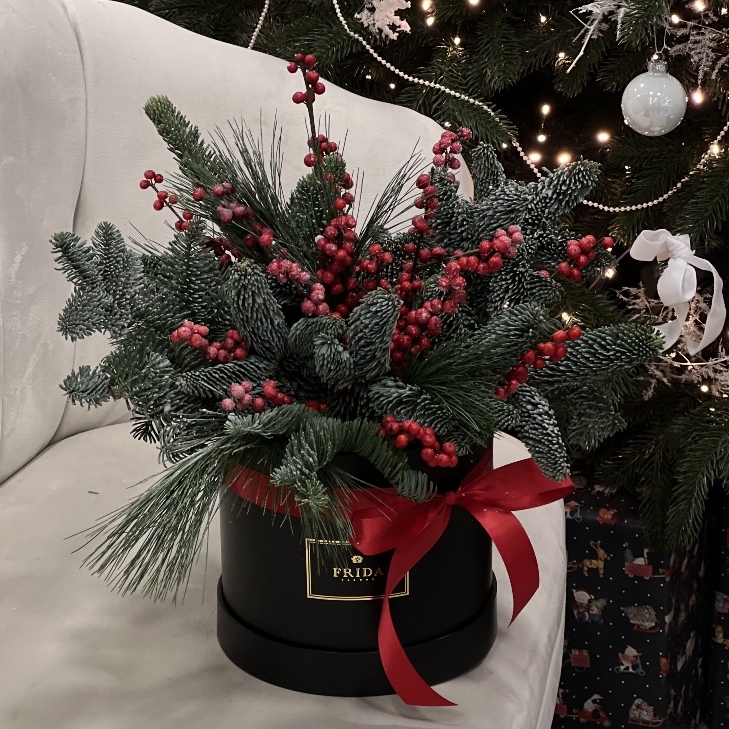 Состав: ветки нобилиса, ветки илекса, ветки пинуса. Цвет коробки можно поменять на ваш выбор.